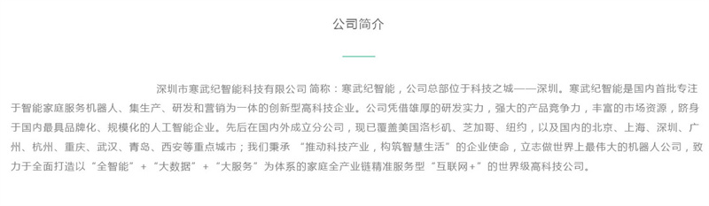 深圳寒武纪智能科技有限公司是由一群有梦想的人组成的团队,我们对技术有着近乎苛刻的要求,不妥协、不投机、坚持初衷。我们始终认为智能机器人不应该是少数人的“玩伴”,它应该走进千家万户,为人类带来更好的体验。