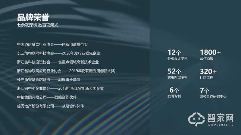 目前,公司拥有外观设计专利12项,实用新型专利52项,发明专利6项,与浙江大学等7所院校建立了合作研究中心,成功与1800+酒店完成智能化合作,已服务320+社区工程,物联网产品