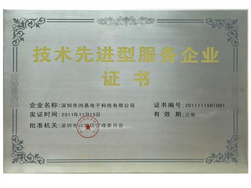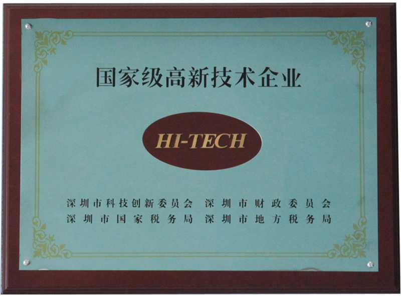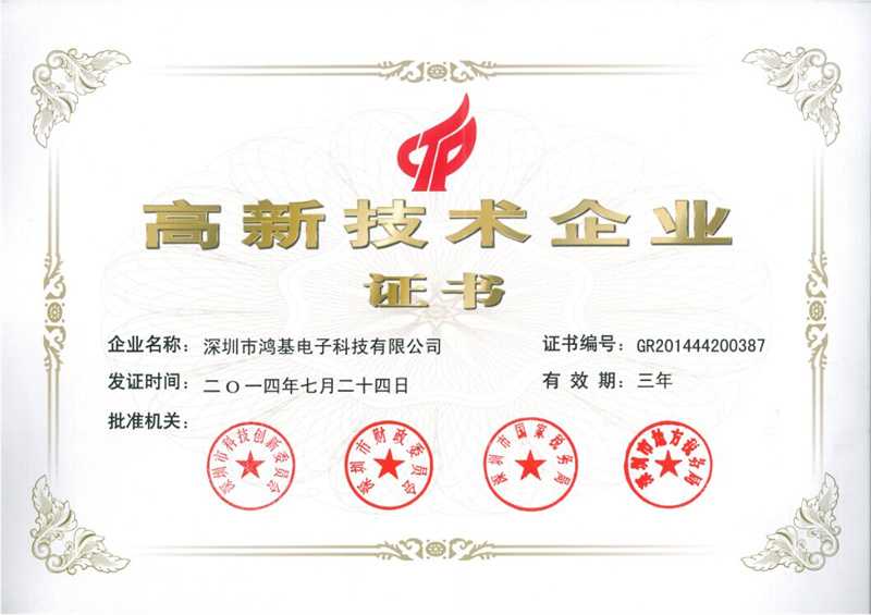 2013年:深圳市鸿基电子科技有限公司以多项创新以及过硬的技术荣获“深圳市高新技术企业”证书荣誉称号。
