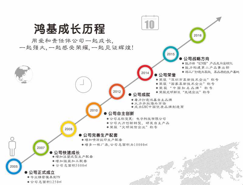 2010年:为了迎接公司快速的发展,发展成为更有生命力的企业,2010年3月份公司更改注册为深圳市鸿基电子科技有限公司。以一体化的加工为后盾,公司另组建立了研发团队,进行了创新转型,研发出自主产品,走上了自主产品之路,开足马力向前进。