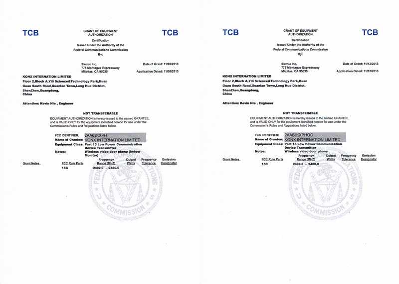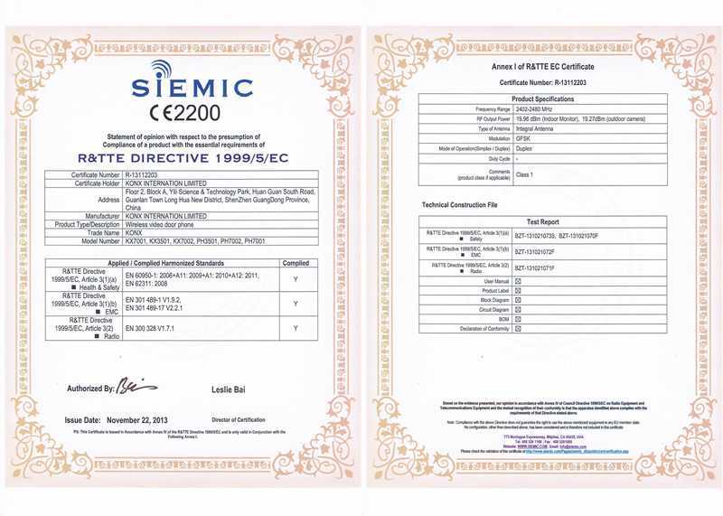 产品已获CE,FCC认证,畅销欧美市场,在国际市场上享有很高的声誉。康鑫泰无线可视对讲系统以欧美流行的简约型设计,简单化操作而著称,主要出口质量要求严格的欧美国家。
