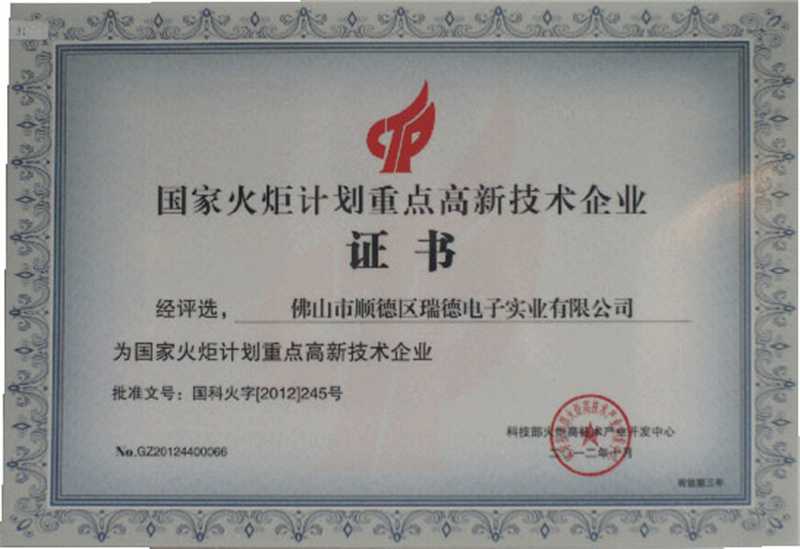 2012年10月 — 公司获评“国家火炬计划重点高新技术企业”。