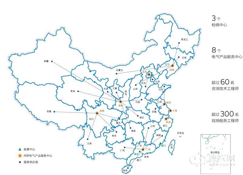 目前,ABB电气产品服务在中国已设立3个检修中心,8个服务中心,并以服务中心为主导,在周边区域设立近100家服务供应商辐射全国。