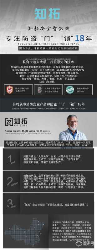 知拓团队根据多年从事防盗门的经验,联合全球知名的卡迪夫大学,采用前国际最新“双核”电子芯片技术,选用国际先进的指纹识辨器,行业领先的电磁技术,独有专利电子锁芯技术,联合广东优质的加工制造企业,研发并生产出来满足消费者需要“美观、方便、安全、耐用”的高品质防盗门智能锁。