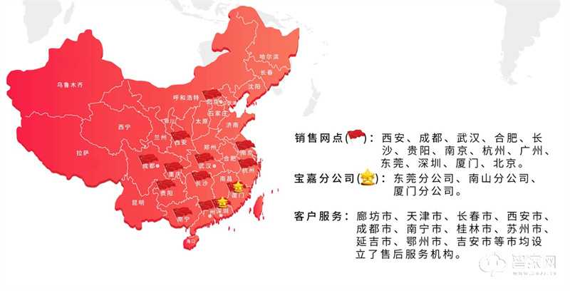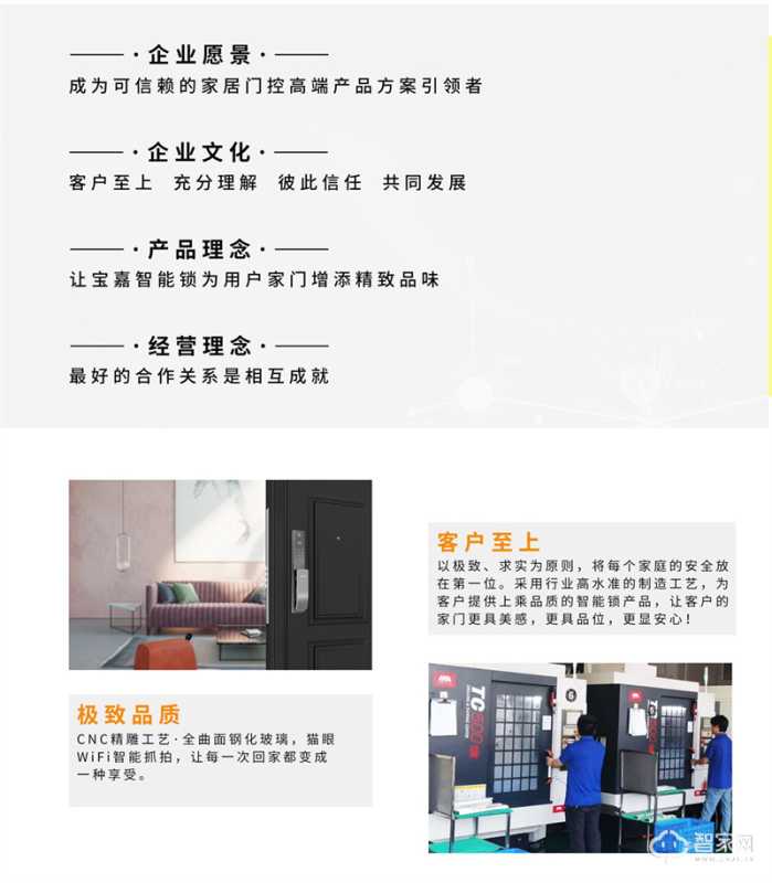 宝嘉公司东莞分公司:专注于电子智能锁、电子锁体、智能家居领域产品研发、制造、销售、售后服务为一体的分支机构。该分支机构拥有四千多平方米的办公场地,拥有研发设计、产品制造、质量检验、产品测试及相关检测配套设备和质量保障的体系。该分支结构主要致力成为行业家居门控高端电子智能锁产品方案引领者,为广大客户提供高水准、高品质、高安全的智能家居锁具的系列产品。为了确保产品高品质,该分支机构拥有一支稳定的专业技术研发、制造、售后服务的专业团队。宝嘉公司制造的智能锁系列产品,在制造工艺上均选用高品质整体铝合金材料,以精雕工艺技术与UV氧化工艺技术制造产品,确保交付到每位客户手中的产品长期使用后仍保持色彩鲜艳不褪色。