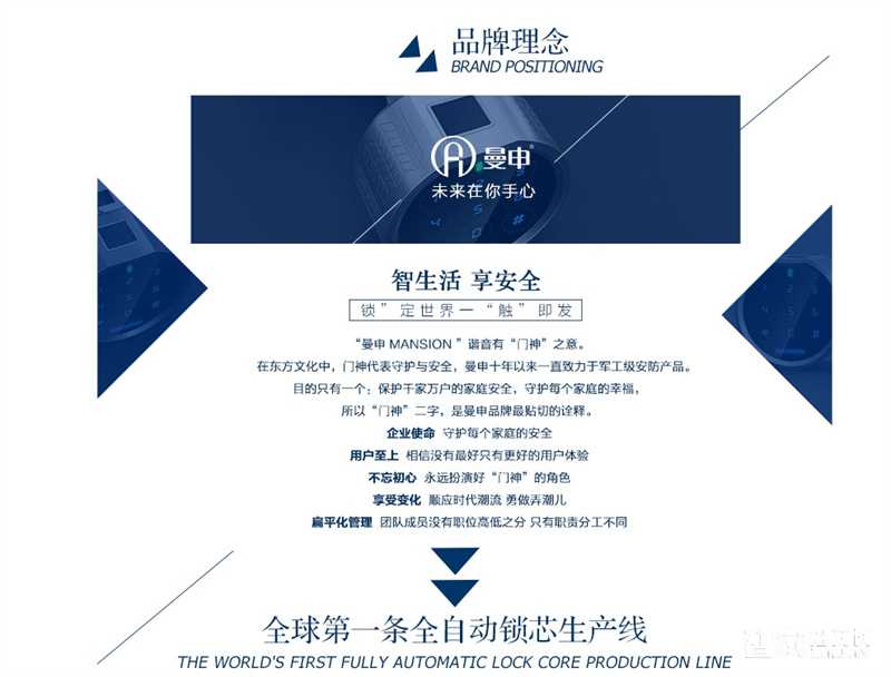 公司依托雄厚的创新研发实力和品牌影响,以市场为导向,现拥有自主知识产权的各项专利技术15项,其中发明专利2项;并陆续推出曼申智能家居物联网系统、曼申智能防盗门控系统、曼申智能电子锁、曼申超B级锁具等四个门类,80多个规格的智能家居及智能安防产品。