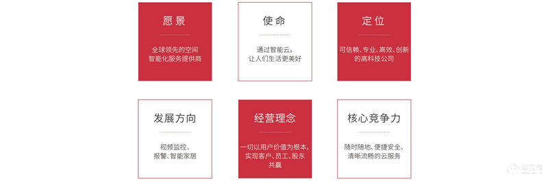 公司致力于成为全球领先的空间智能化服务提供商。 业务范围涵盖:智能安防系列产品(云摄像机、云盒子、报警设备等)、智能家居系列产品、云服务(云存储、大数据处理、人工智能应用等)。
