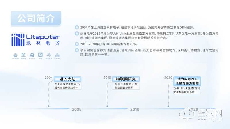 Lite-Puter做为一个国际品牌,于2005年进军大陆市场,成立永林电子(上海)有限公司,具有完整的研发、销售、及生产团队,为中国市场提供优质、即时的产品及服务,至今已被行业内认可为具有技术前沿的高端智能照明控制品牌,并被各地区的知名五星级酒店认可并采用,包含有洲际酒店、万豪酒店、索菲特酒店、香格里拉酒店、喜来登酒店、铂尔曼酒店、君悦酒店、凯悦酒店、威斯汀酒店、凯宾斯基酒店、悦榕庄、涵碧楼、豪生酒店、假日酒店、开元酒店、锦江酒店、金陵酒店…等。并增加新产品线应用于大型公共建设如机场、车站,以及户外大型LED景观照明控制,更着力于物连网时代智能家居的产品整合。未来Lite-Puter仍将着重于产品研发与客户服务,带领客户节能、省电、环保因应未来绿色革命的新时代。