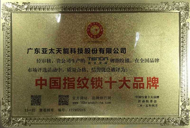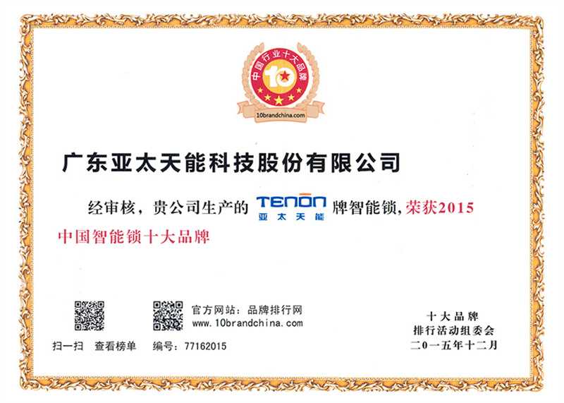 2015年12月:亚太天能荣获“中国智能锁十大品牌”。