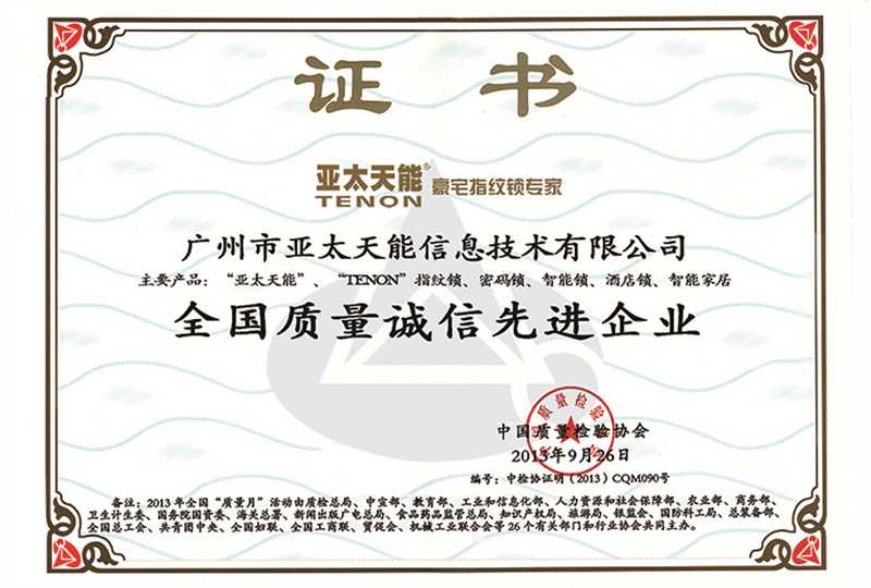 2013年9月:亚太天能被评为“全国质量诚信先进企业”。