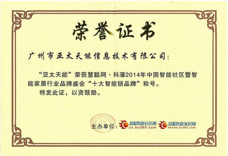 2014年10月:荣获慧聪网•科濠2014年中国智能社区暨智能家居行业品牌盛会“十大智能锁品牌”称号。